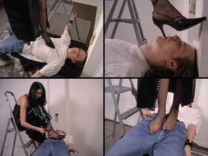 Aleksandra takes off her shoes and makes him kiss her feet.